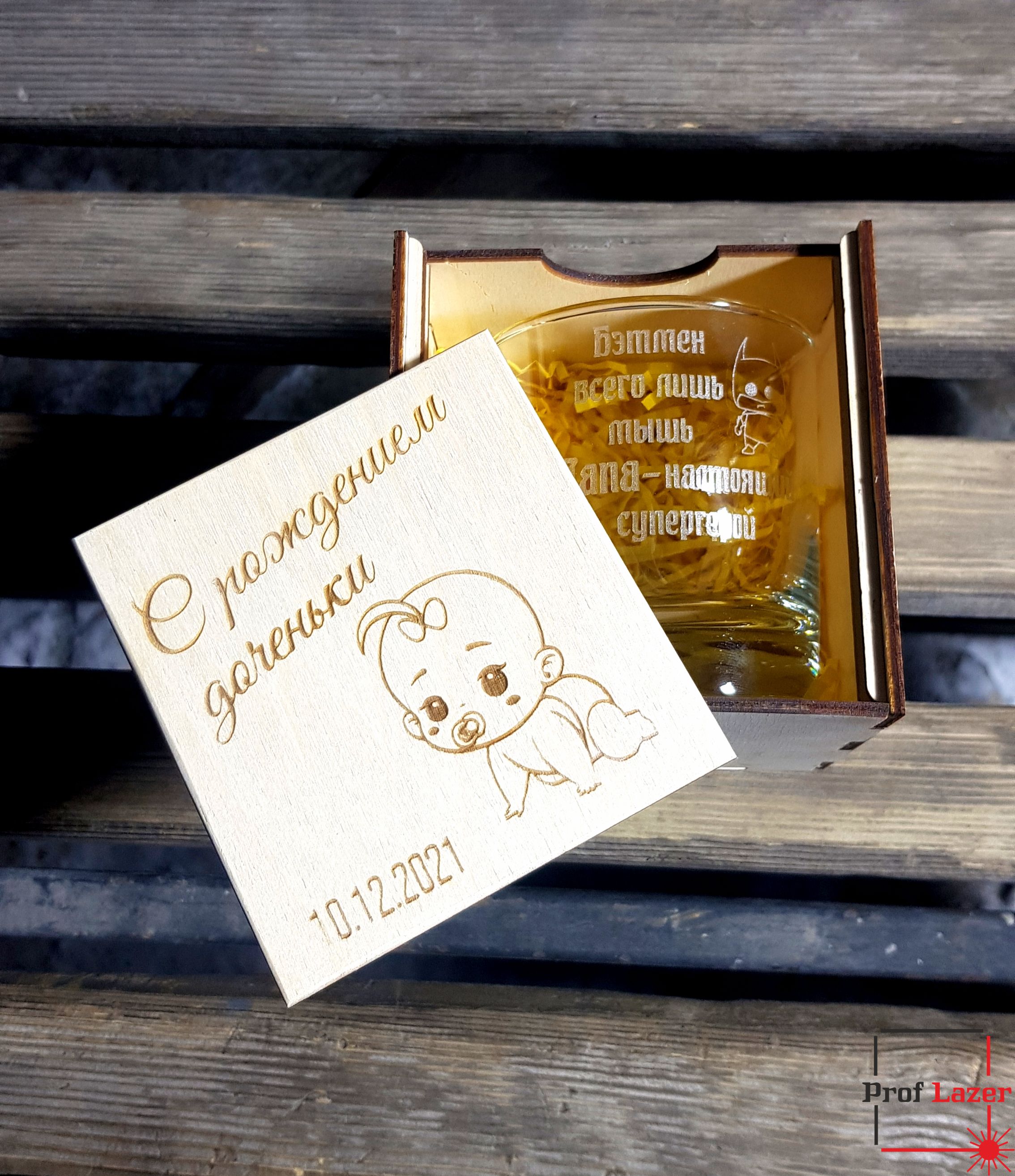 Индивидуальная лазерная граивровка на бокале и подарочном бокве.