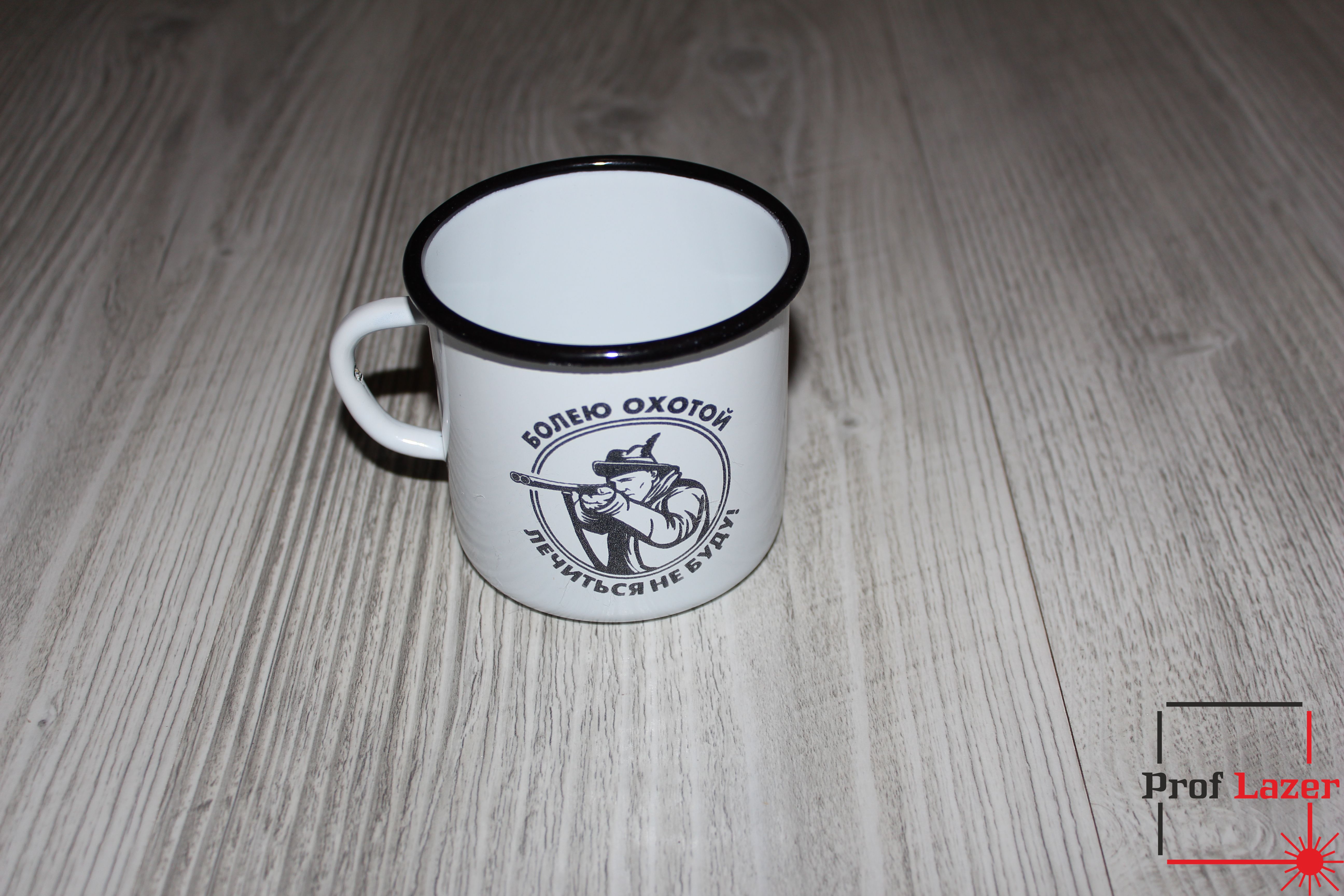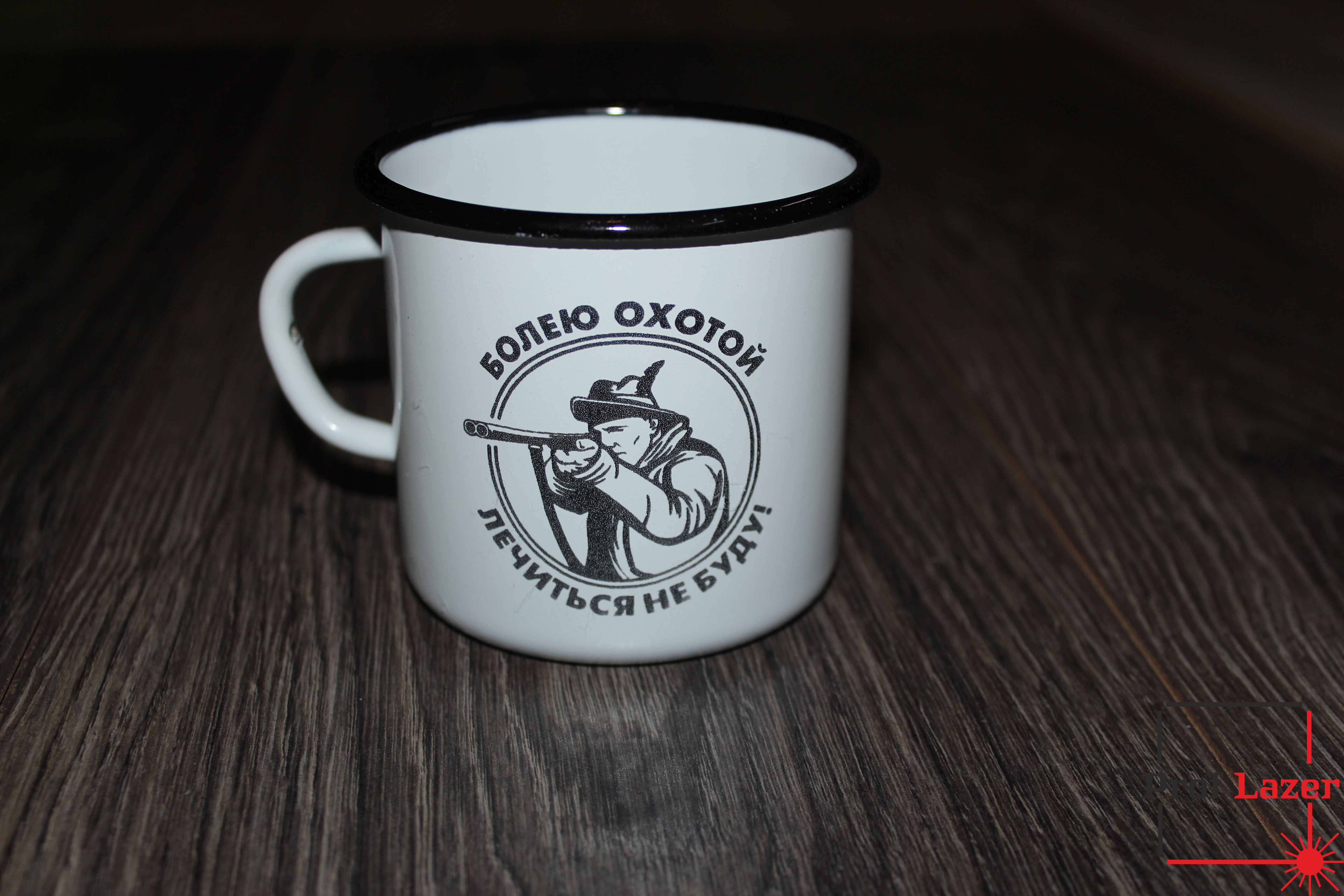 Гравировка на эмалированной кружке "Болею охотой. Лечиться не буду".
