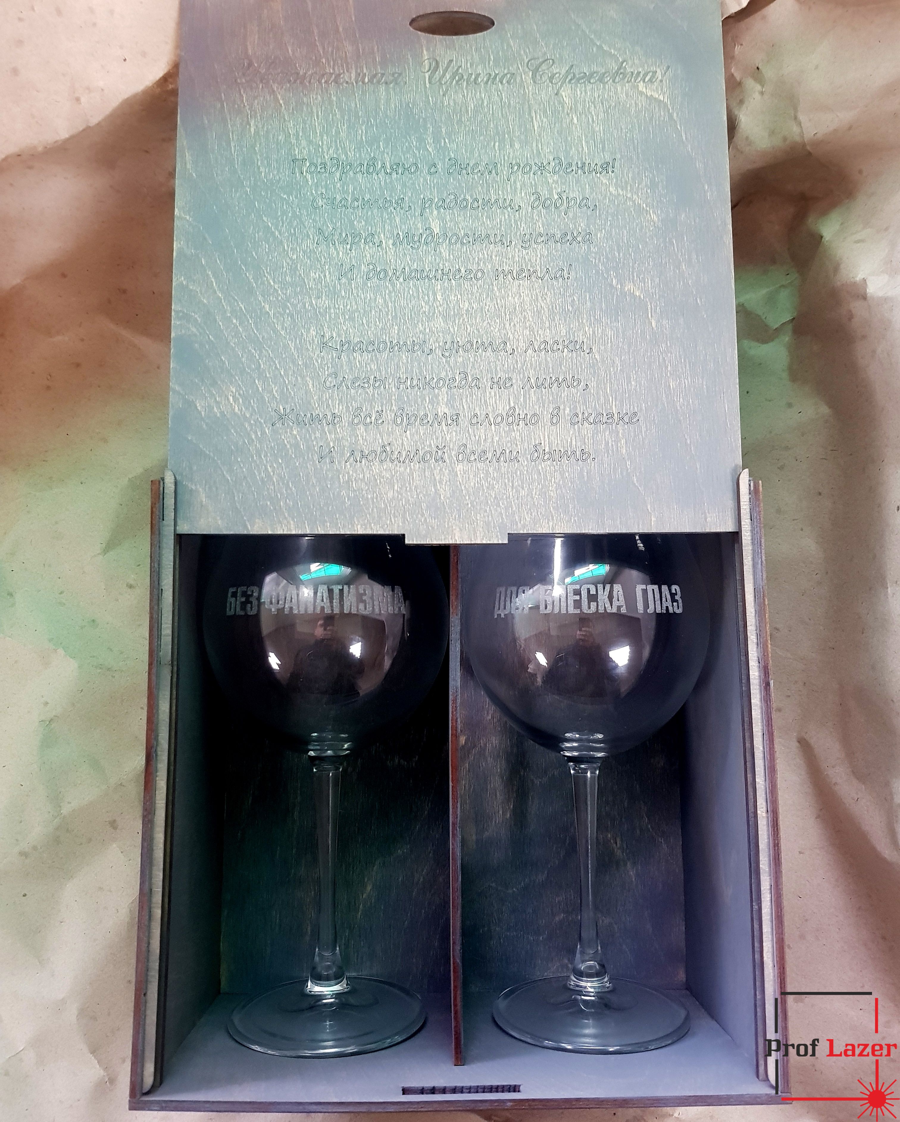 Набор подарочный из двух винных бокалов с гравировкой, в деревянной упаковке.