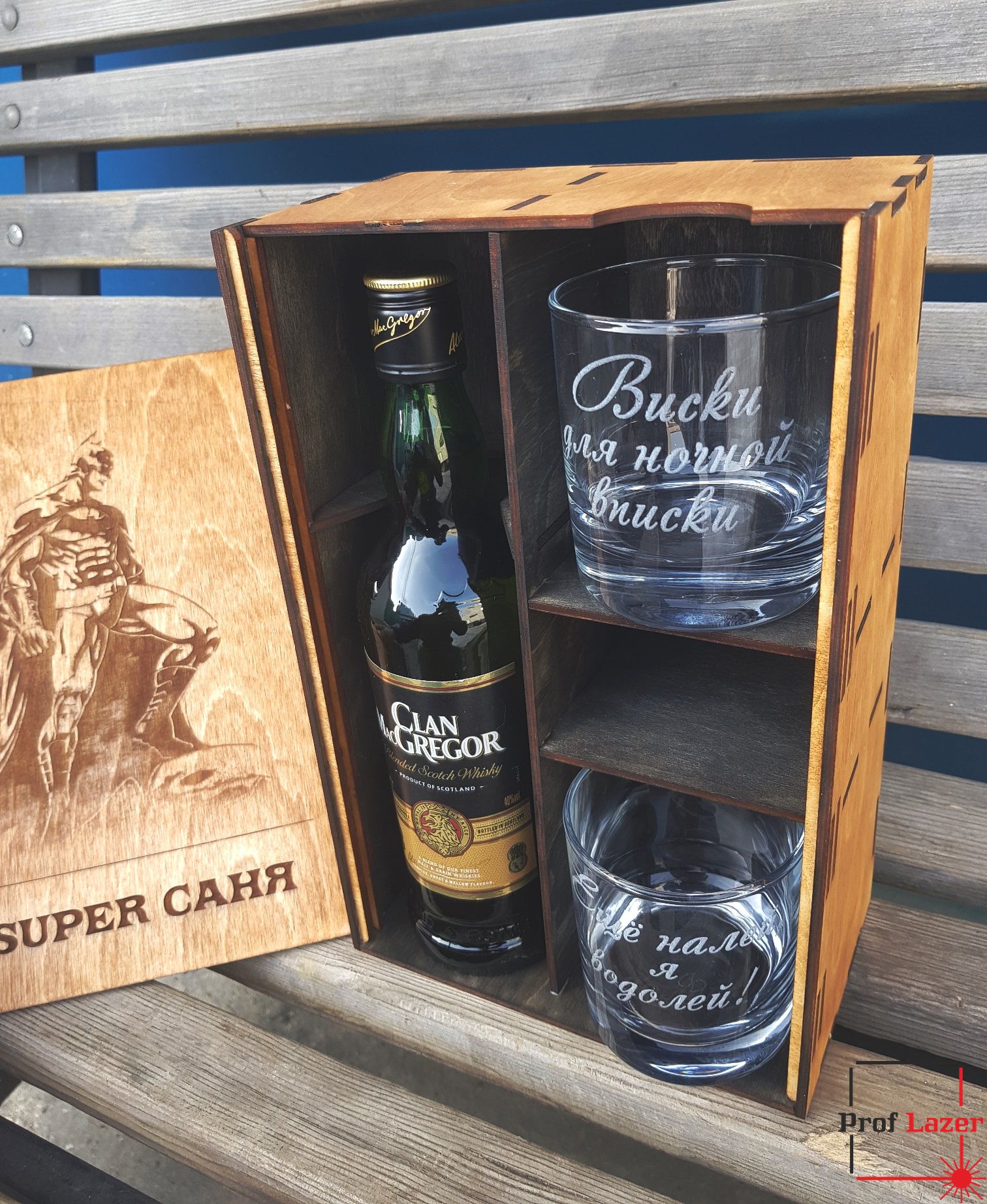 Деревянная коробка под виски*, бокалы с гравировкой и отделением под различные вкусные мелочи.