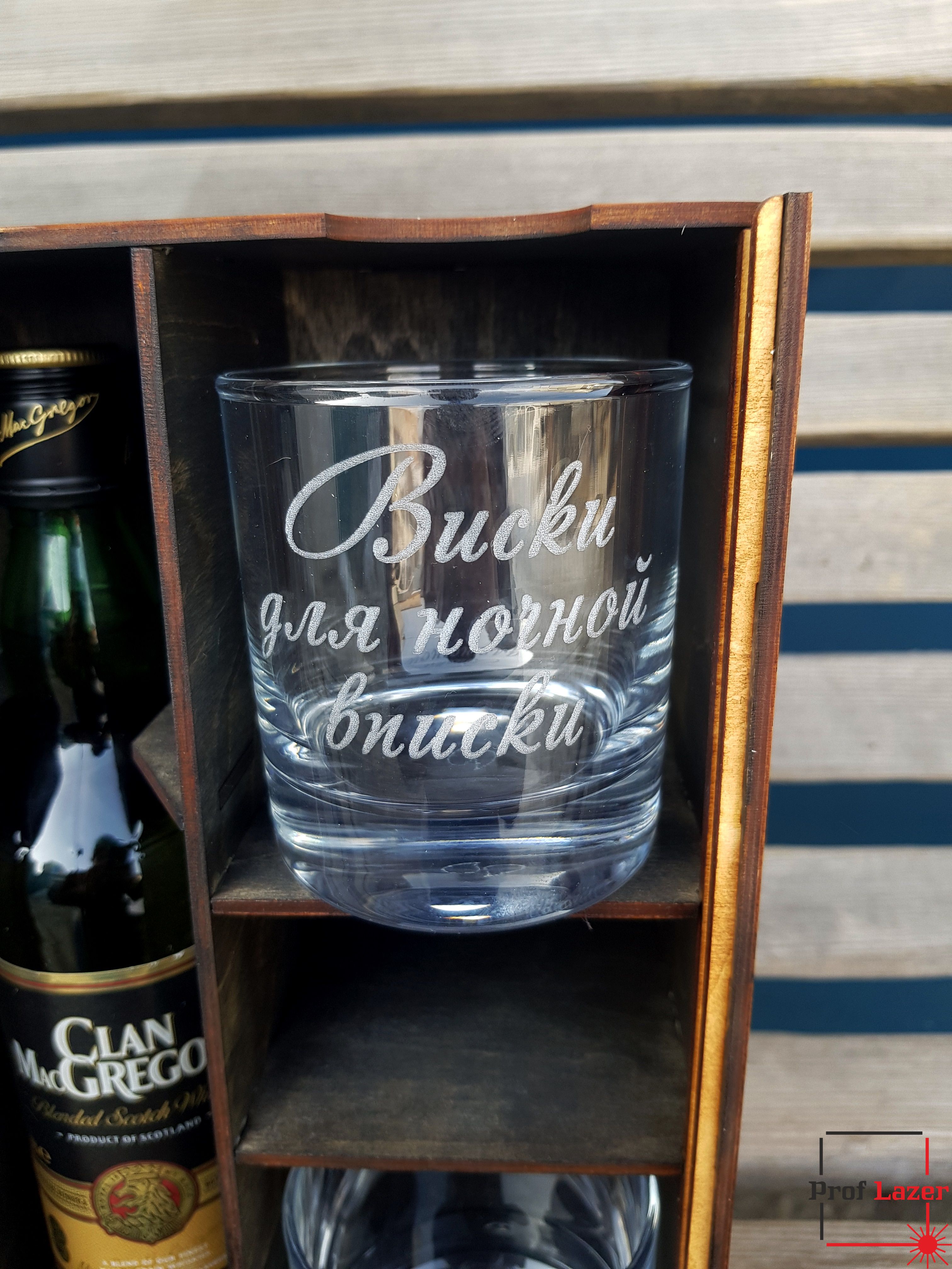 Подарочная упаковка под виски* и бокалы с индивидуальной лазерной гравировкой.
