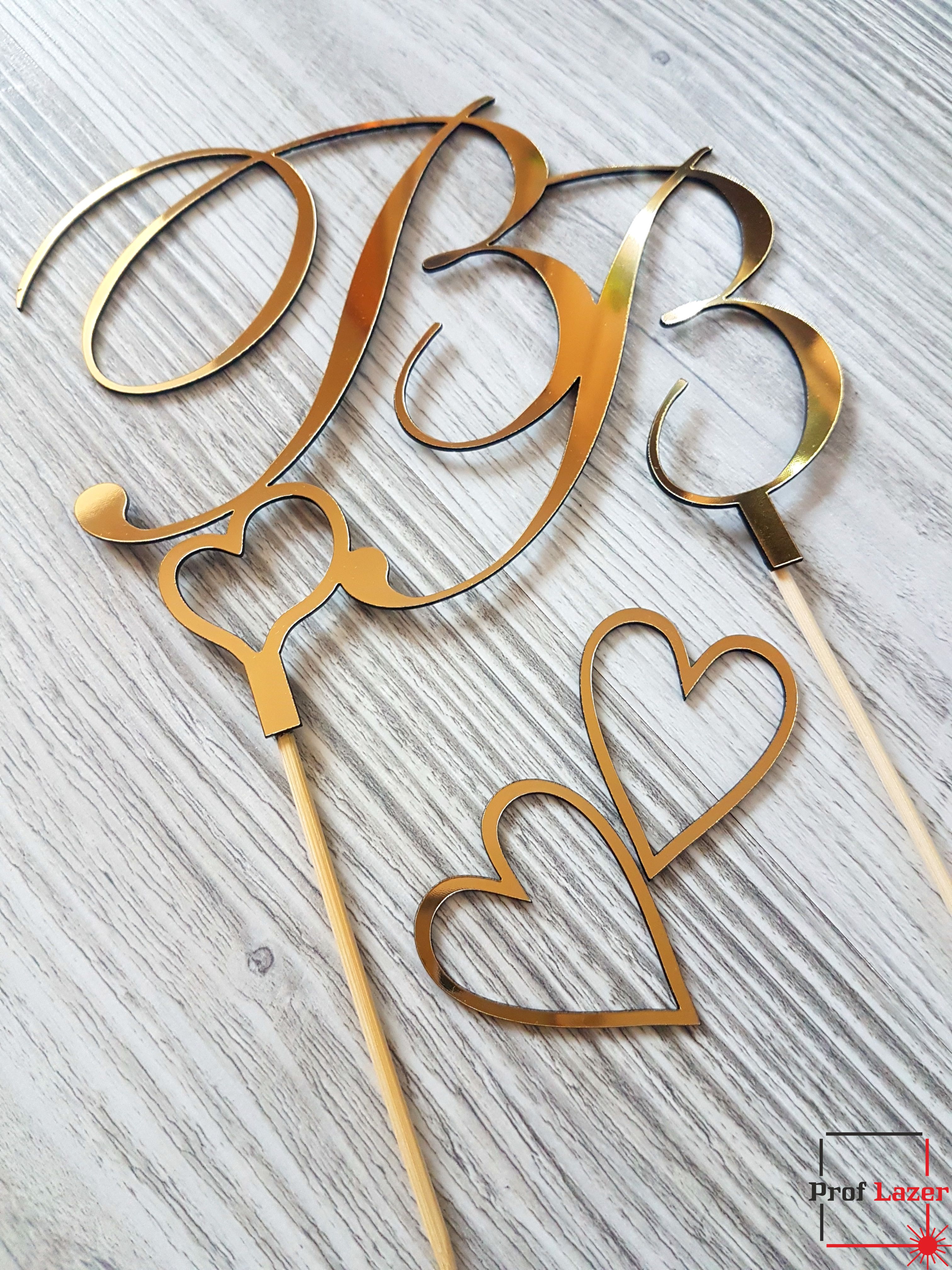 Топпер на свадьбу с инициалами из зеркального золотого пластика.